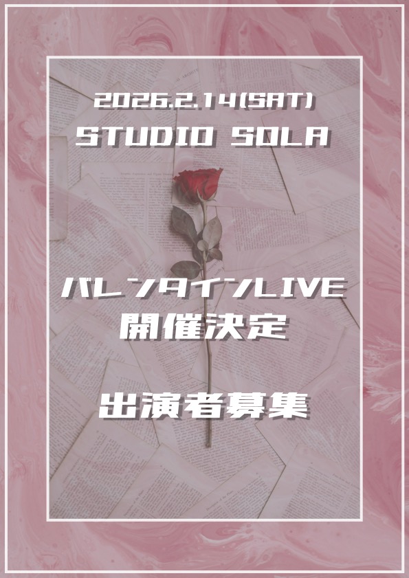 ![]() | 2026.02.14(SAT) Studio Sola pre. バレンタイン Live 出演者募集中!! 出演費用 高校生以下:¥1,500-/人 大学生:¥2,500-/人 お申し込みはこちら |
