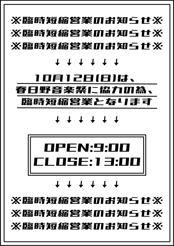 10月12日(日)は、春日野音楽祭協賛の為、下記の時間で短縮営業致します